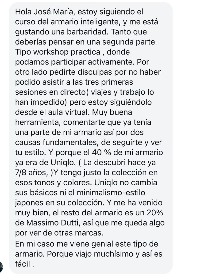 Salva - "Estuve hace unos minutos en la clase, soy de Albacete y soy abogado. Siempre fui ese perfil que le gustaron las camisas de cuadros. Gracias a ti empecé a vestir con más coherencia y a aportar a mis clientes esa seriedad. Yo no voy a tirar 10 prendas ¡voy a tirar 20! Gracias por la sesión"